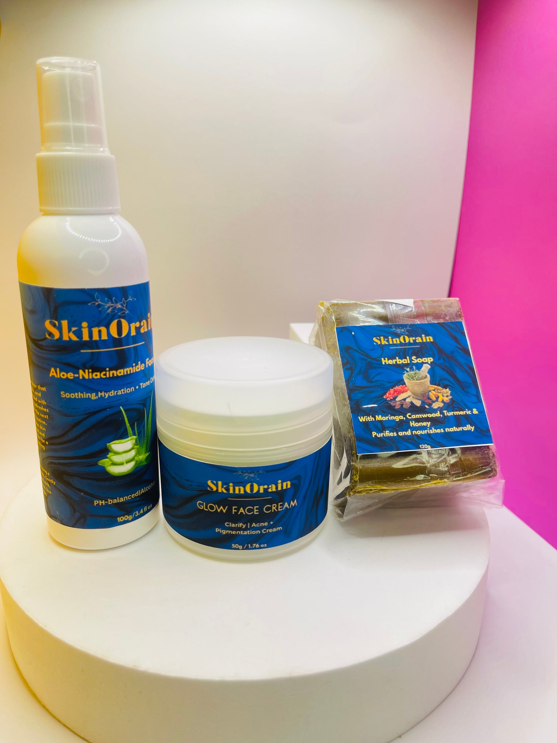 Our Glow Face Combo is a complete skincare ritual designed to purify, treat, and rejuvenate your complexion. Thoughtfully formulated for all skin types, this trio works in perfect harmony to promote a clear, even toned, and luminous glow.